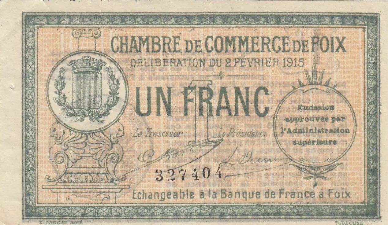 Billet France 1 Franc - Chambre de Commerce - Foix - 02-02-1915 - Série 327