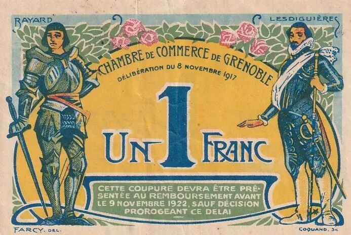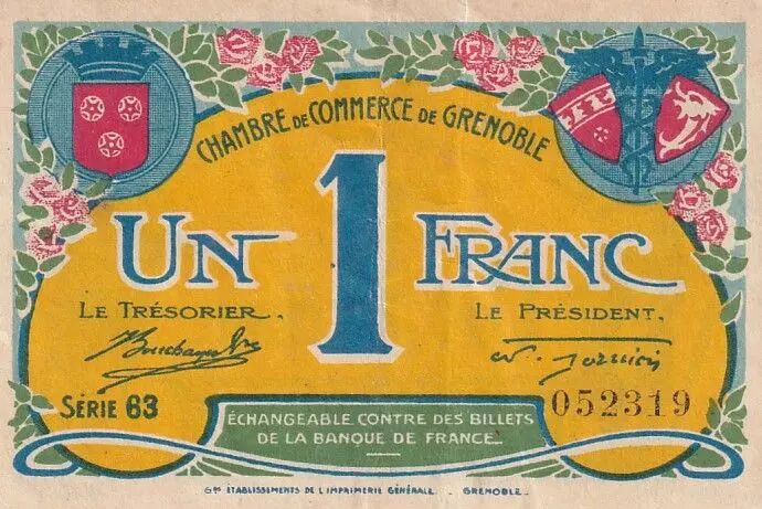 Ce billet de 1 Franc, émis par la Chambre de Commerce de Grenoble en 1917, représente un témoignage de l'histoire économique locale française durant cette période.