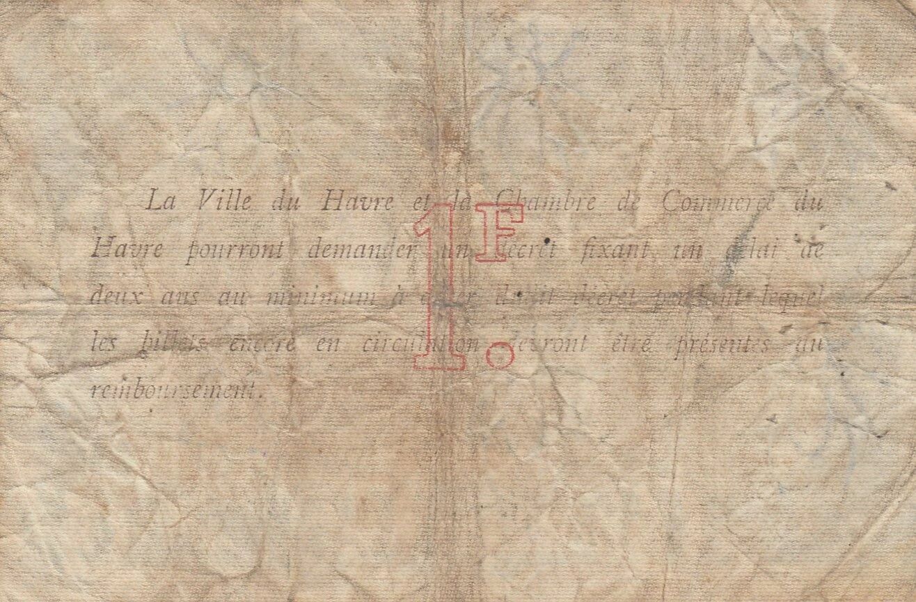 Au recto, le billet présente une composition où prédomine l'inscription "Chambre de Commerce du Havre". La valeur nominale "1 Franc" est clairement indiquée. On y trouve également des éléments graphiques et des ornements typiques des billets de cette époque, ainsi que les signatures des responsables de l'émission.