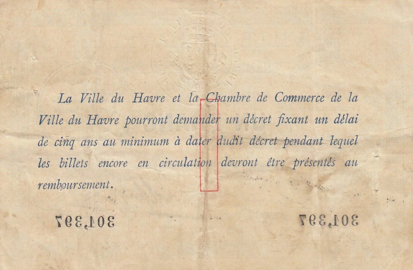 Ce billet de 1 Franc a été émis par la Chambre de Commerce du Havre entre 1914 et 1925. Il représente une forme de monnaie de nécessité, émise en période de troubles économiques ou de pénurie de monnaie fiduciaire.