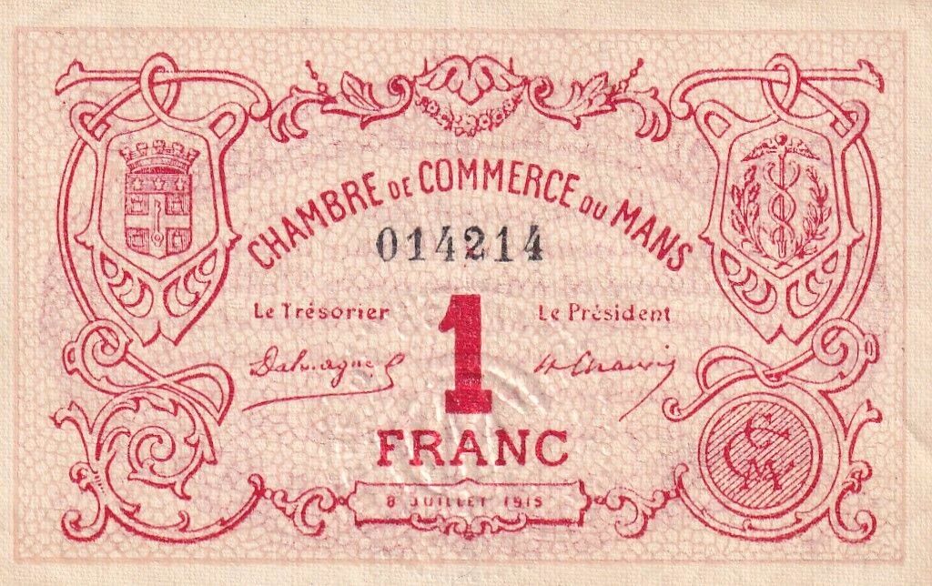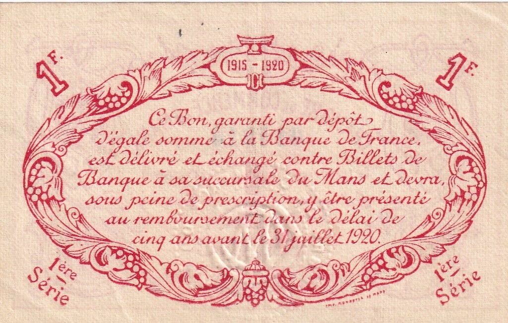 Ce billet de 1 Franc a été émis par la Chambre de Commerce du Mans le 8 juillet 1915, faisant partie de la 1ère série. Il s'agit d'un bon garanti par un dépôt d'égale somme au Trésor.