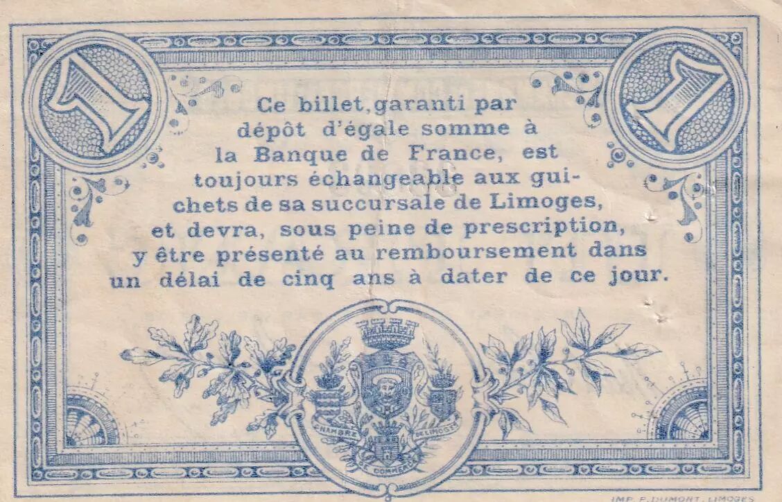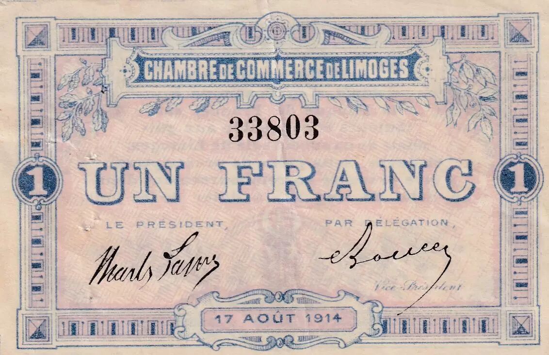 Ce billet de 1 Franc a été émis par la Chambre de Commerce de Limoges le 17 août 1914. Il s'agit d'une émission de nécessité, une pratique courante en période de crise économique ou de guerre, lorsque les monnaies officielles se font rares.