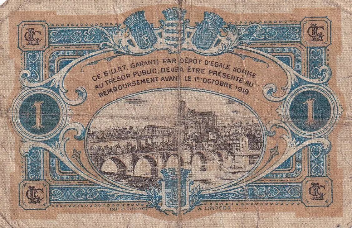 Le verso du billet fournit des informations essentielles concernant sa garantie et son remboursement. Il est stipulé que ce billet est garanti par un dépôt d'égale somme à la Banque de France, assurant ainsi sa valeur. De plus, il est précisé que le billet est échangeable aux guichets des succursales de Tulle et Brive de la Banque de France. Une clause importante mentionne que le billet doit être présenté au remboursement dans un délai de cinq ans à dater de son émission, sous peine de prescription. L'inscription "IMP P DUMONT LIMOGES" indique l'imprimeur responsable de la fabrication du billet, à savoir l'Imprimerie Pierre Dumont située à Limoges, en France.