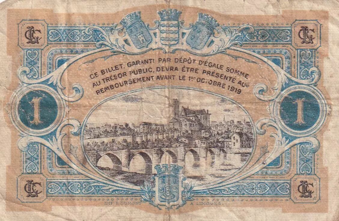 Sur le recto, on peut lire l'inscription "CHAMBRE DE COMMERCE DE LIMOGES", suivie de la valeur nominale "UN FRANC". Les signatures du Président et du Trésorier de la Chambre de Commerce sont également présentes, authentifiant ainsi le billet.