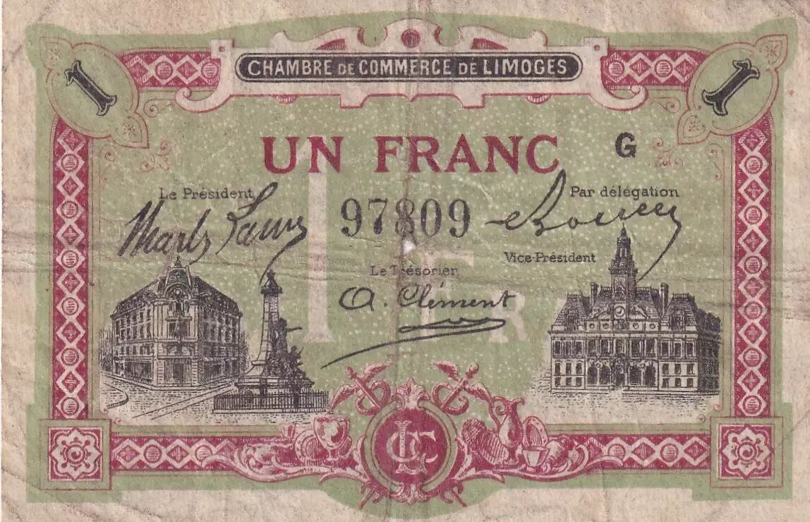 Ce billet de 1 Franc a été émis par la Chambre de Commerce de Limoges en 1918, comme l'indique l'inscription "CHAMBRE DE COMMERCE DE LIMOGES" sur le recto. Le recto du billet présente également le numéro de série "97809", suivi de la mention "Série G". La valeur nominale "UN FRANC" est clairement indiquée, accompagnée des mentions "Le Président" et "Le Trésorier", suggérant les signatures des responsables de l'émission.