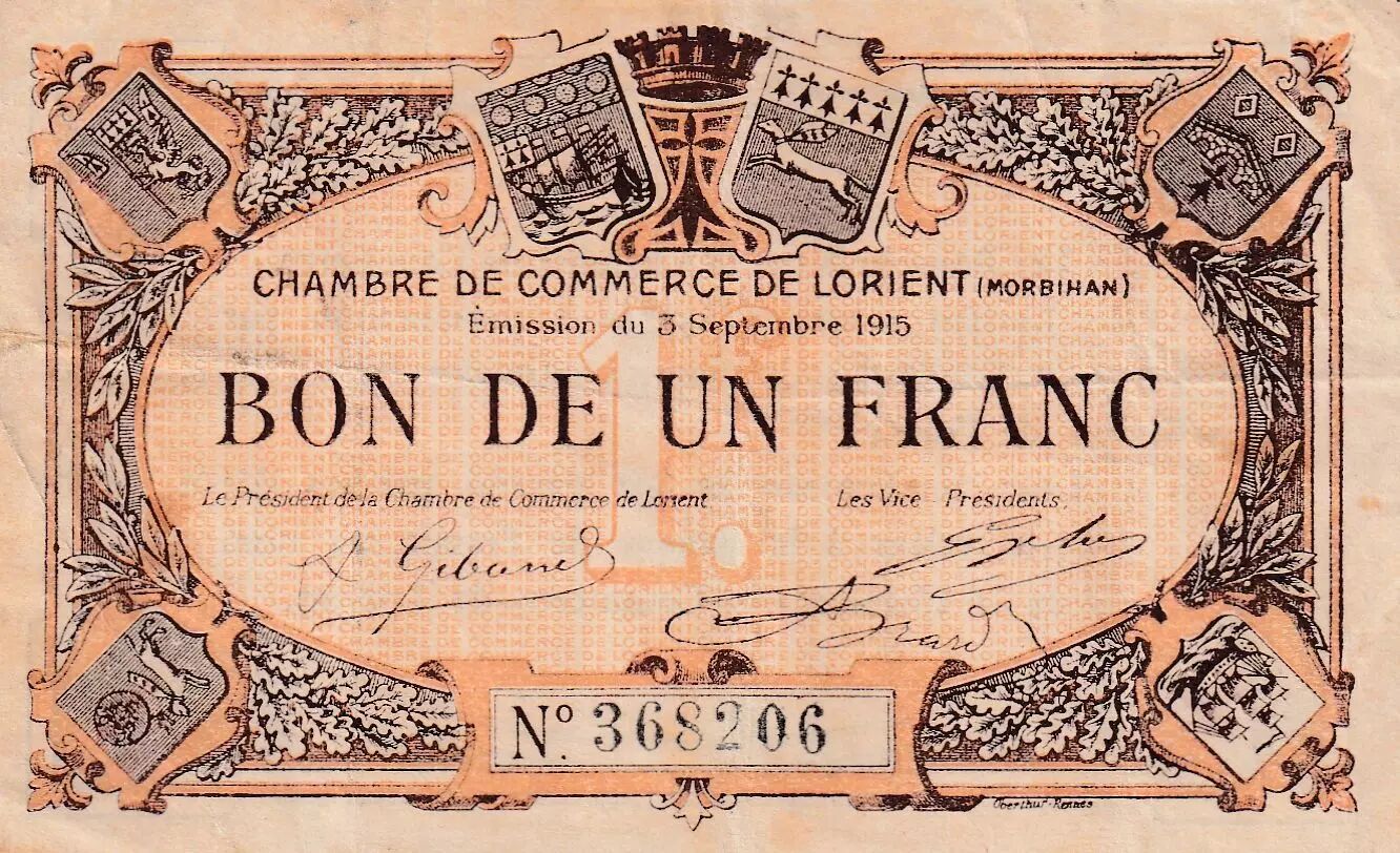 Ce billet de 1 Franc a été émis par la Chambre de Commerce de Lorient en 1915. Il s'agit d'un bon émis le 3 septembre 1915.