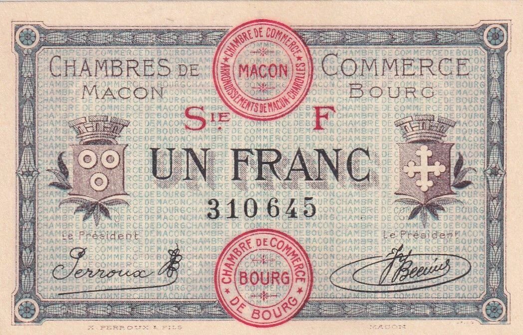 This 1 Franc note was issued by the Chamber of Commerce of Mâcon and Bourg in 1921. It represents a nominal value of 50 centimes and is part of the F series.