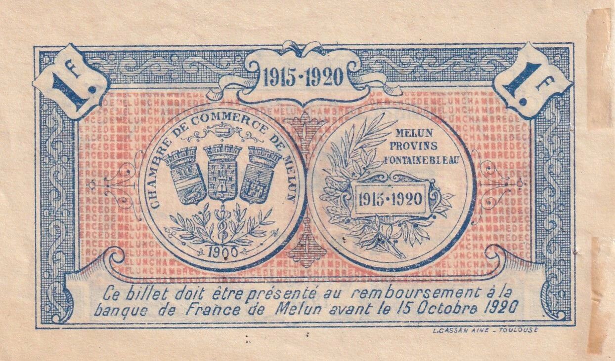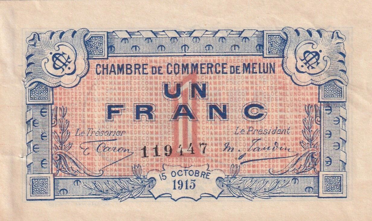 Ce billet de nécessité, émis par la Chambre de Commerce de Melun, date de 1915. Sa valeur nominale est d'un franc.