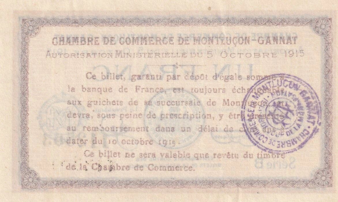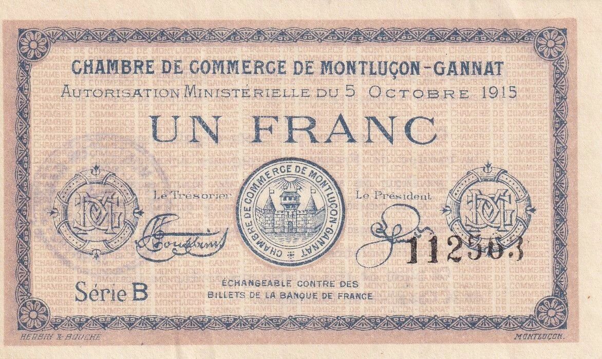 Ce billet de 1 franc a été émis par la Chambre de Commerce de Montluçon-Gannat, en France, suite à l'autorisation ministérielle du 5 octobre 1915.