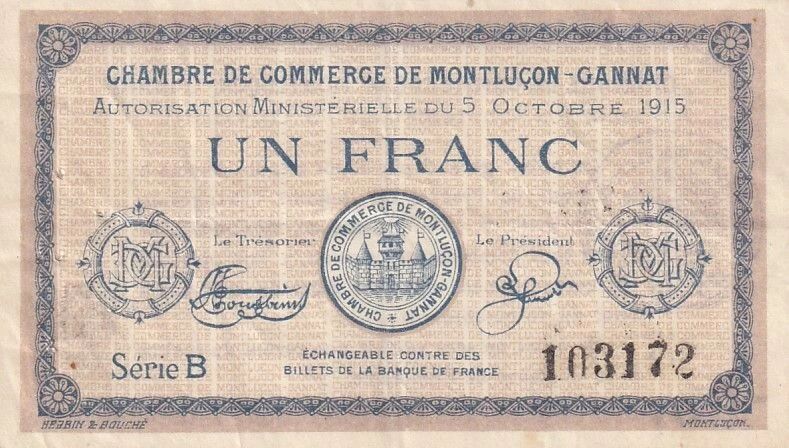 On the obverse, the words "CHAMBRE DE COMMERCE DE MONTLUÇON - GANNAT" can be read at the top of the banknote. Below, it says "Autorisation ministérielle du 5 octobre 1915". The face value, "UN FRANC", is clearly indicated. The signatures of the Treasurer and the President also appear, followed by the series designation "Série B" and the number "103172". The printer's name, "HERBIN & BOUCHÉ MONTLUÇON", is mentioned at the bottom of the banknote.