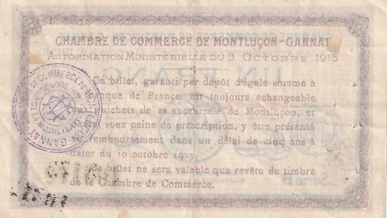 This 1 franc banknote was issued by the Chamber of Commerce of Montluçon-Gannat, France, following ministerial authorization on October 5, 1915. The banknote belongs to Series B.