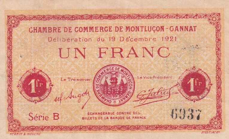 Ce billet de 1 franc a été émis par la Chambre de Commerce de Montluçon-Gannat, avec l'autorisation ministérielle datée du 19 décembre 1921. Il s'agit d'un billet de nécessité, émis dans un contexte économique particulier, où les moyens de paiement officiels pouvaient être limités.