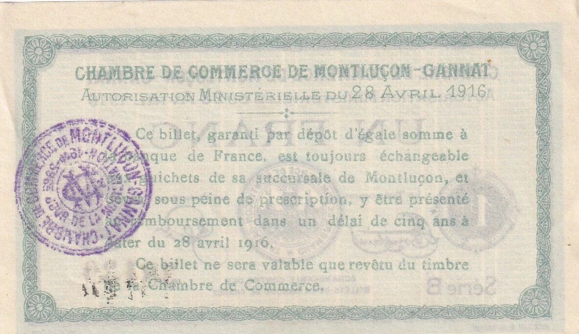L'existence de ce billet témoigne du contexte économique et social particulier de la Première Guerre mondiale, où les pénuries de métaux précieux ont conduit à la création de monnaies alternatives. La Chambre de Commerce de Montluçon-Gannat, en tant qu'émetteur, a joué un rôle crucial dans le maintien de l'activité économique locale.
