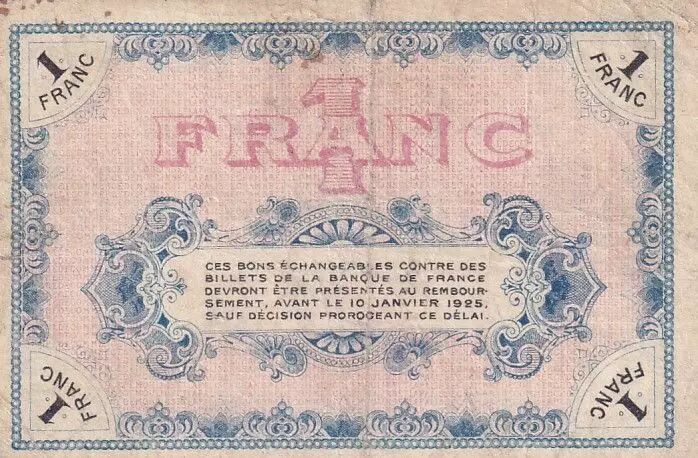 Le verso du billet comporte la valeur nominale "1 Franc" répétée plusieurs fois. Une inscription précise que "ces bons échangeables contre des billets de la Banque de France devront être présentés au remboursement, avant le 15 décembre 1922 sauf décision prorogeant ce délai." Cette indication temporelle souligne la nature temporaire de ce moyen de paiement émis dans un contexte économique particulier.