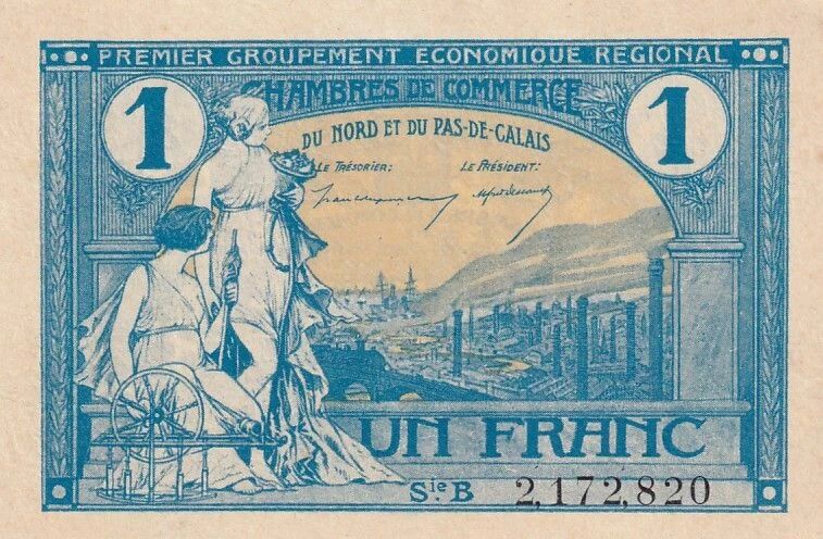 Ce billet de 1 franc a été émis en 1917 par les Chambres de Commerce du Nord et du Pas-de-Calais, il appartient à la Série B. Il s'agit d'une émission de nécessité, destinée à pallier le manque de numéraire pendant la Première Guerre mondiale.