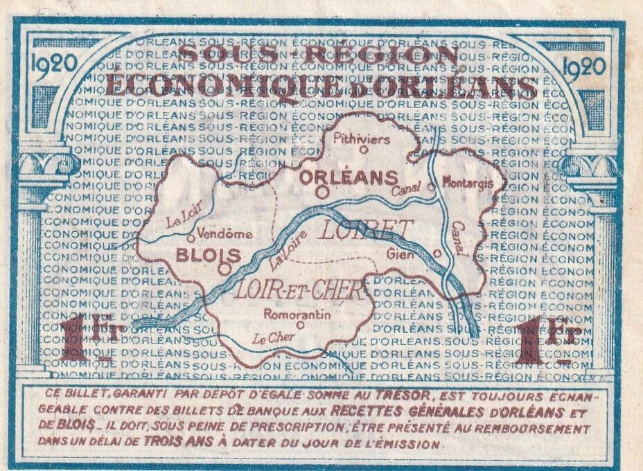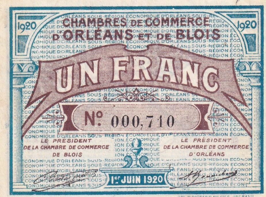 Ce billet de 1 Franc a été émis le 1er juin 1920 par les Chambres de Commerce d'Orléans et de Blois. Il s'agit d'un billet de nécessité, émis dans un contexte économique particulier après la Première Guerre Mondiale.