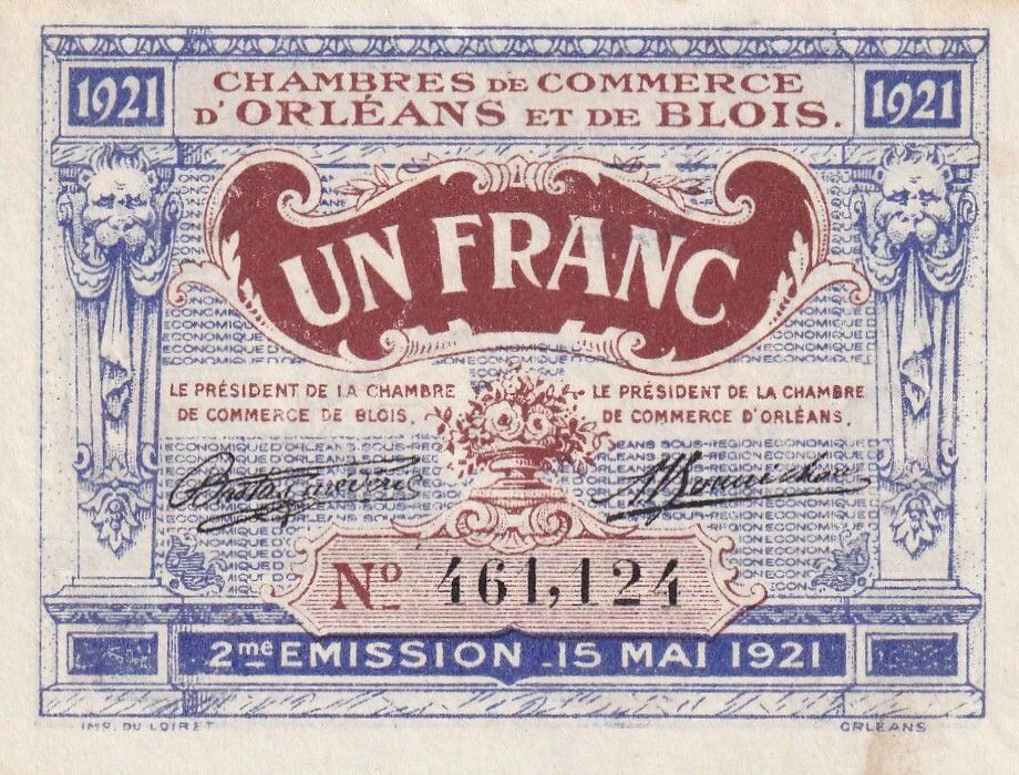 Ce billet de 1 Franc, émis par les Chambres de Commerce d'Orléans et de Blois, date du 15 mai 1921 et représente la deuxième émission de ce type. Le recto du billet arbore l'inscription "CHAMBRES DE COMMERCE D'ORLÉANS ET DE BLOIS" en lettres capitales, suivie de la mention de la valeur nominale "UN FRANC". Un numéro de série, ici "N° 461.124", est imprimé sur le billet, ainsi que les signatures des présidents des Chambres de Commerce de Blois et d'Orléans. La date d'émission, "15 mai 1921", et la mention "2ème émission" sont également présentes. Le nom de l'imprimeur, "IMP. P. PIGELET ET FILS - ORLEANS", figure en bas du recto.