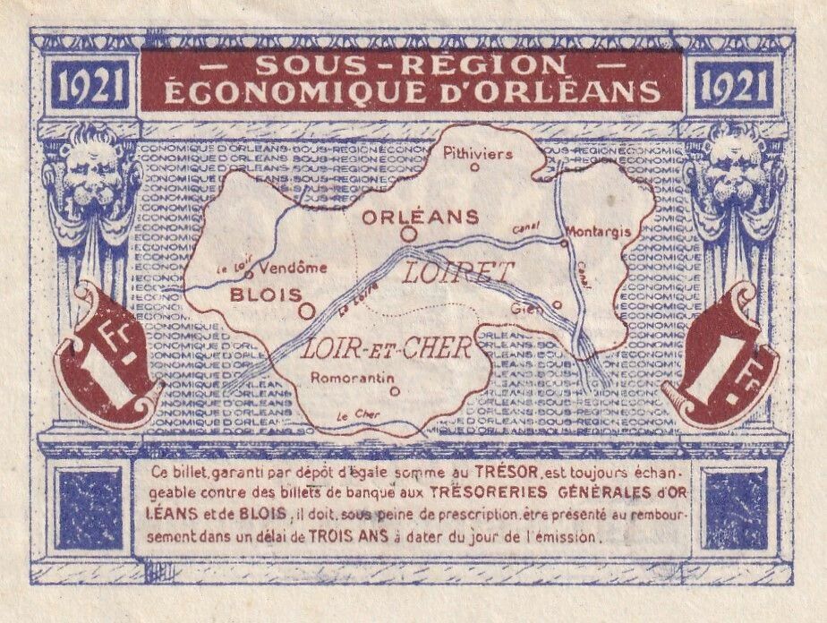 Le verso du billet affiche l'inscription "SOUS-REGION ECONOMIQUE D'ORLEANS" en lettres capitales, suivie de la valeur nominale "1Fr". Le filigrane du billet représente des abeilles, un motif récurrent dans les émissions de cette époque. L'imprimeur, Tardy - Pigelet & fils, Bourges, France, est responsable de l'impression de ce billet.