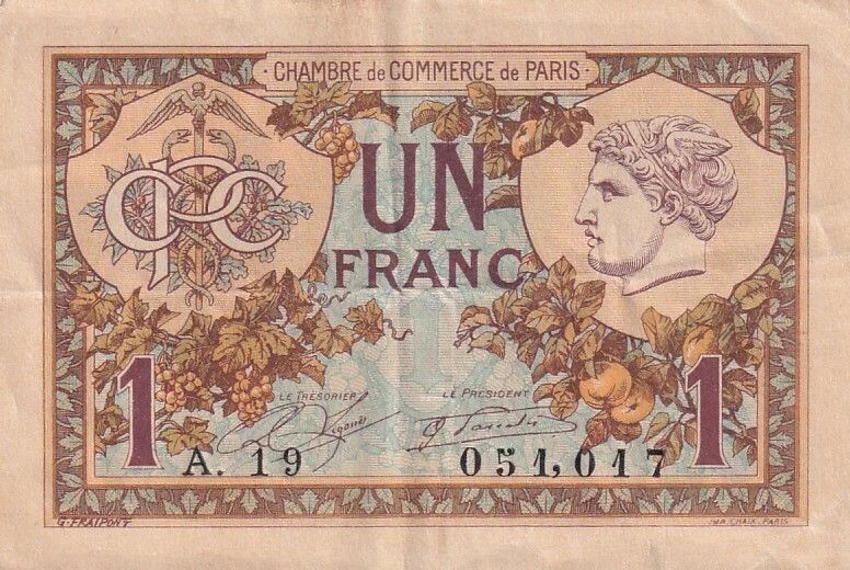 This French banknote with a face value of one franc was issued by the Paris Chamber of Commerce on March 10, 1920. It belongs to series A.19.