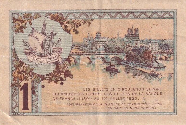 The back of the banknote offers a view of the Île de la Cité. A medallion surrounded by plant motifs, containing a representation of a ship, is visible on the left. The main inscription indicates the exchange conditions of the banknotes: "LES BILLETS EN CIRCULATION SERONT ECHANGEABLES CONTRE DES BILLETS DE LA BANQUE DE FRANCE JUSQU'AU 1er JUILLET 1922 (DELIBERATION DE LA CHAMBRE DE COMMERCE DE PARIS EN DATE DU 10 MARS 1920)". The number "1" is repeated at the bottom of the banknote.