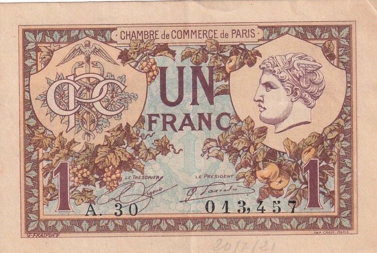 This 1 franc banknote was issued by the Paris Chamber of Commerce on March 10, 1920. It belongs to series A.30 and bears the number 013.457. The front of the banknote features ornamental plant motifs, adorned with a winged caduceus integrated into a medallion positioned on the left. On the right, another medallion depicts the head of Mercury, recognizable by his winged helmet, a symbol of commerce and communication.