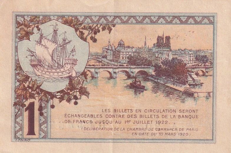 On the back, the banknote offers a view of the Île de la Cité, an emblematic place in Paris. A medallion adorned with vegetation frames a ship, a heraldic motif. The text specifies that the banknotes in circulation were exchangeable for banknotes of the Banque de France until July 1, 1922, in accordance with the deliberation of the Paris Chamber of Commerce dated March 10, 1920. The face value "1" is also repeated on the back.