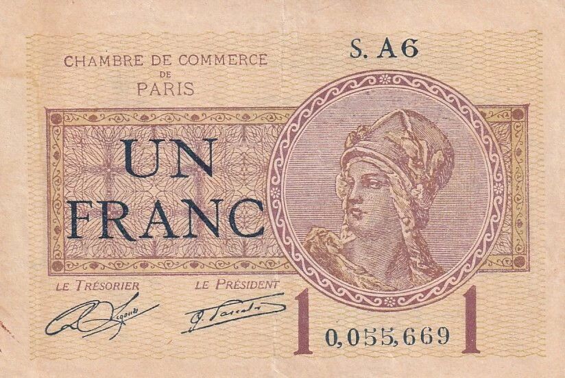 This 1 Franc banknote was issued by the Paris Chamber of Commerce, dated March 10, 1920, and is part of the S.A6 series. It is a banknote type of product issued in France.