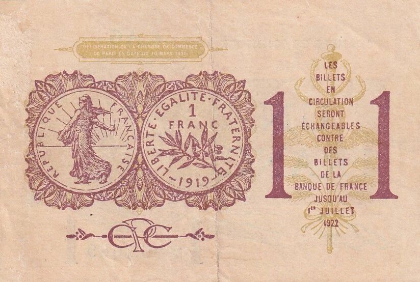 The back of the banknote features, on the left, a front and back representation of a 1 franc Semeuse coin dated 1919, surrounded by geometric patterns. The following inscriptions appear: "DELIBERATION DE LA CHAMBRE DE COMMERCE DE PARIS EN DATE DU 10 MARS 1920", followed by "CPC" at the top center. In the center, there is a multi-line statement: "LES BILLETS EN CIRCULATION SERONT ÉCHANGEABLES CONTRE DES BILLETS DE LA BANQUE DE FRANCE JUSQU'AU 1er JUILLET 1922". The value "1" is inscribed at the bottom.