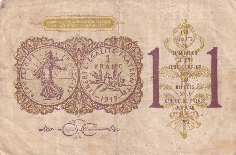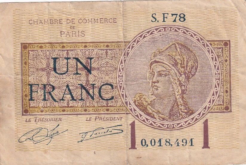 This 1 franc banknote was issued by the Paris Chamber of Commerce on March 10, 1920. It belongs to the S.F78 series and bears the number 0.018.491.