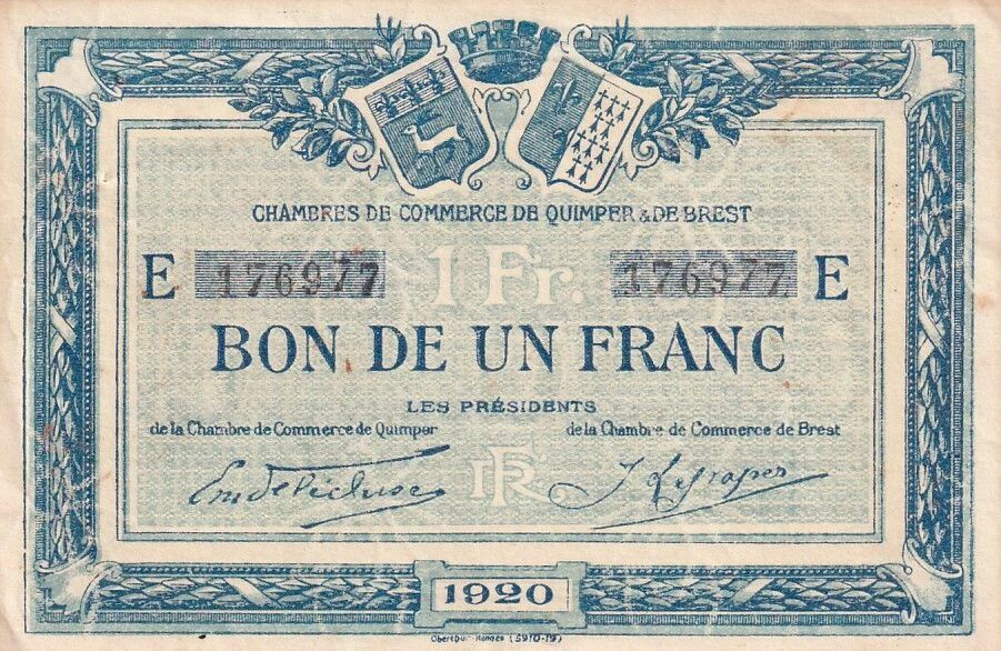 Ce billet de banque français, d'une valeur nominale de un franc, a été émis en 1920 par la Chambre de Commerce de Quimper et Brest. Il s'agit d'un type de produit spécifique lié à une émission locale ou régionale, distinct des billets émis par la Banque de France.