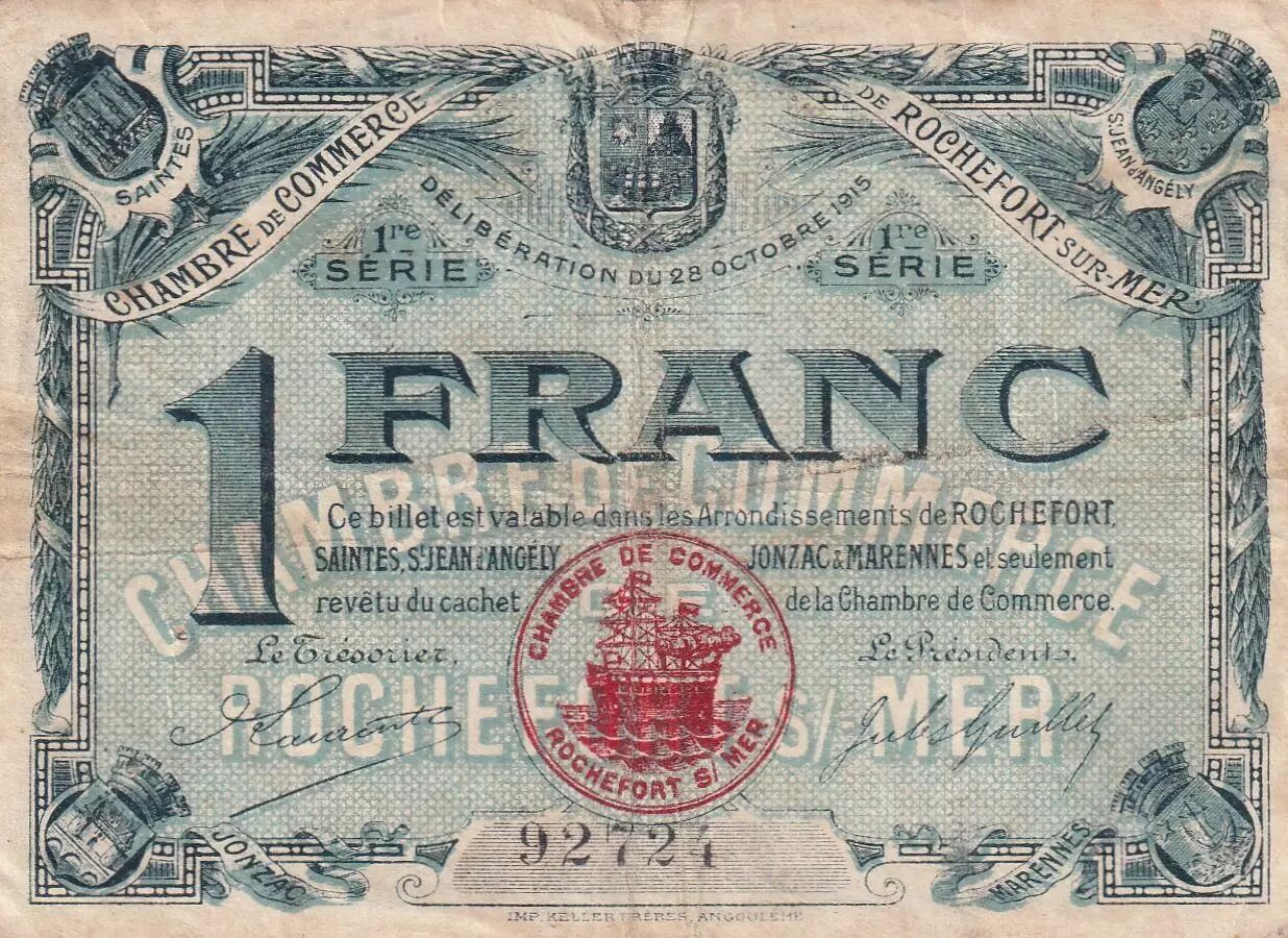 The obverse of the banknote features several essential inscriptions. It includes the mention "1ère SERIE" at the top, followed by the designation of the issuing institution: "CHAMBRE DE COMMERCE DE ROCHEFORT-SUR-MER". The date of the resolution authorizing the issue, "October 28, 1915", is also indicated. The face value, "1 FRANC", is clearly displayed. The signatures of the Treasurer and the President of the Chamber of Commerce are affixed, authenticating the banknote. A serial number, "92724", is printed to identify each banknote individually. The name of the printer, "IMP KELLER FRERES ANGOULÊME", appears at the bottom, indicating the company responsible for the banknote's production.