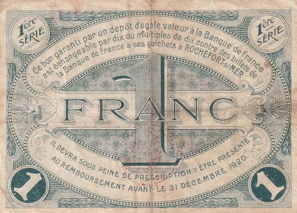 The 1 Franc banknote issued by the Rochefort-sur-Mer Chamber of Commerce, dated October 28, 1915, represents a form of emergency currency issued in the context of the economic constraints of the First World War. This banknote belongs to the first series issued by this chamber of commerce.