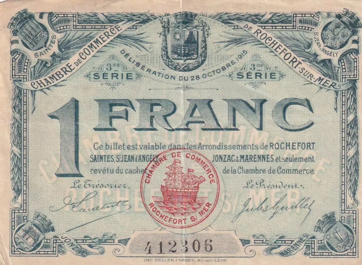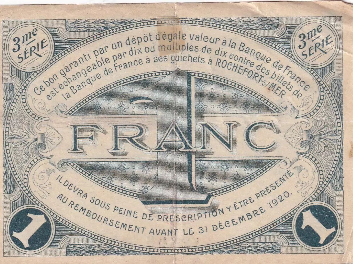 This 1 Franc banknote, issued by the Chamber of Commerce of Rochefort-sur-Mer, dates from October 28, 1915. It belongs to the third series of banknotes issued by this chamber of commerce.