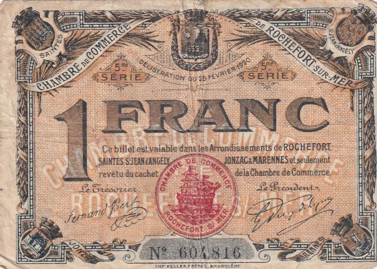 The front of the banknote features several Latin inscriptions. It includes the mention of the series "5ème SERIE" at the top, followed by the issuing entity "CHAMBRE DE COMMERCE DE ROCHEFORT-SUR-MER". The date of the deliberation, "Délibération du 25 Février 1920", is also indicated. The nominal value "1 FRANC" is clearly visible, accompanied by the signatures of the Treasurer and the President. A serial number, "604.816", is printed. The name of the printer, "IMP KELLER FRERES ANGOULÊME", also appears on this side.