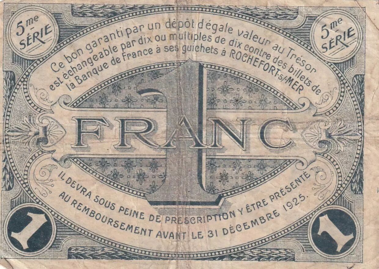 This 1 Franc banknote was issued by the Chamber of Commerce of Rochefort-sur-Mer. It belongs to the 5th series and was put into circulation following the deliberation of February 25, 1920.