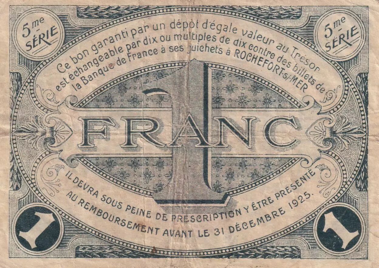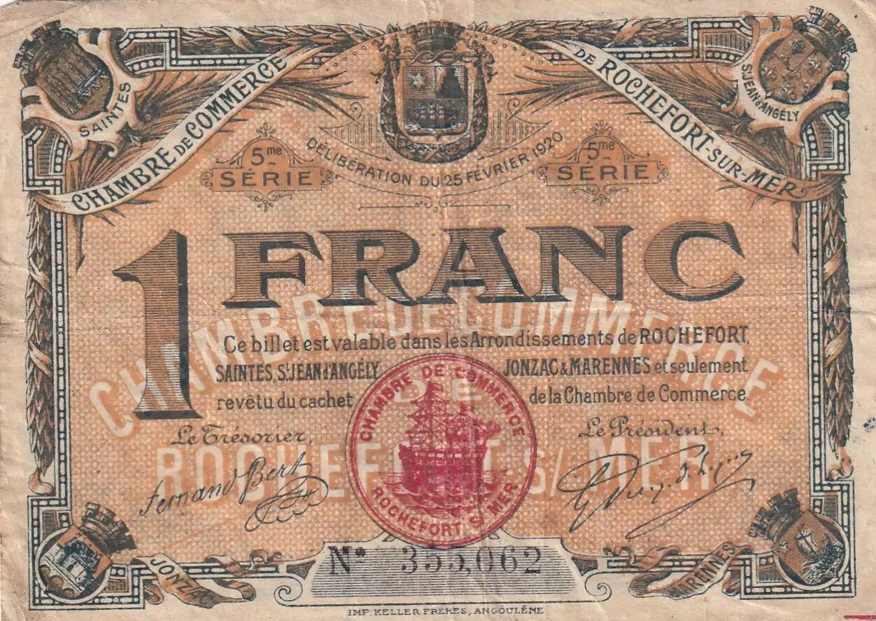 This 1 Franc banknote issued by the Rochefort-sur-Mer Chamber of Commerce, dated February 25, 1920, belongs to the 5th series of this issue. It is a type of paper money issued locally in France during this period.