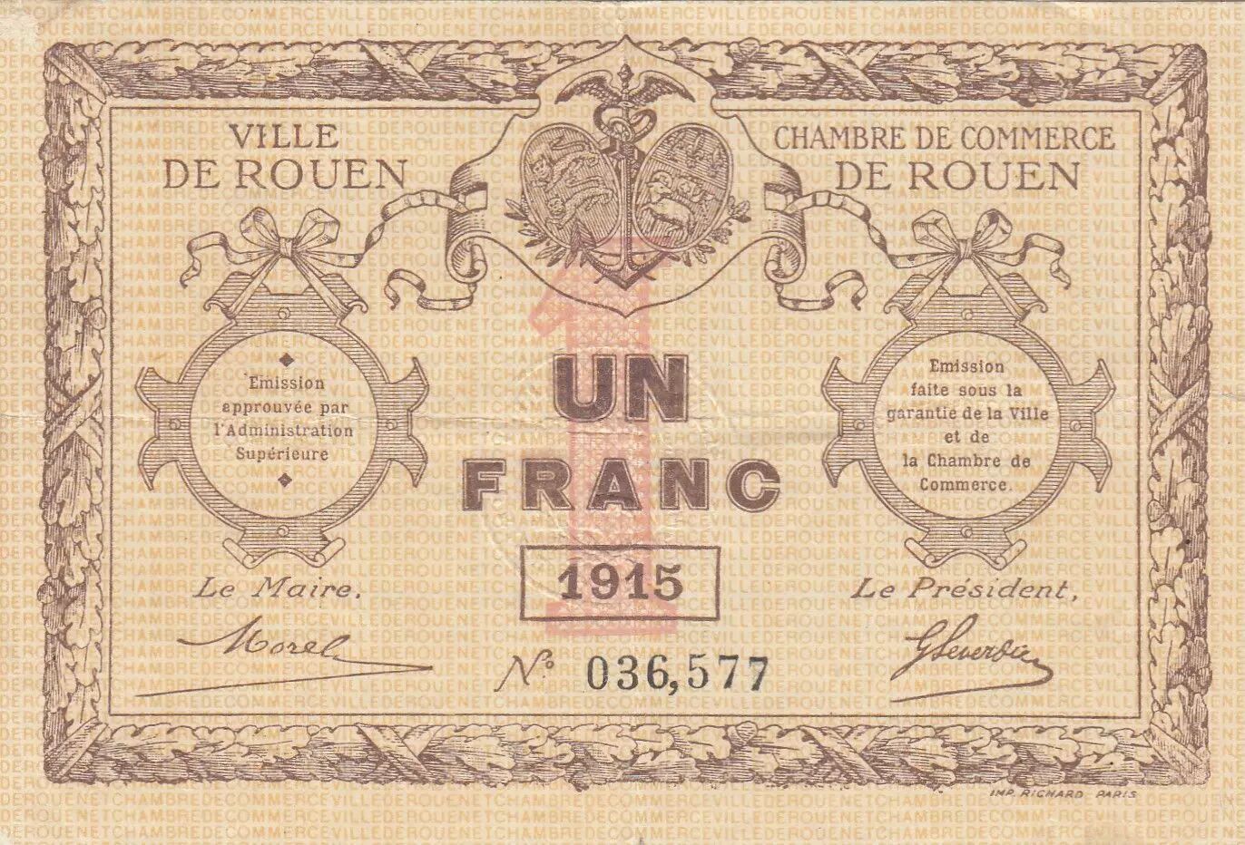 Banknote France 1 Franc - Chambre de commerce - Rouen - 1915 - Serial 036