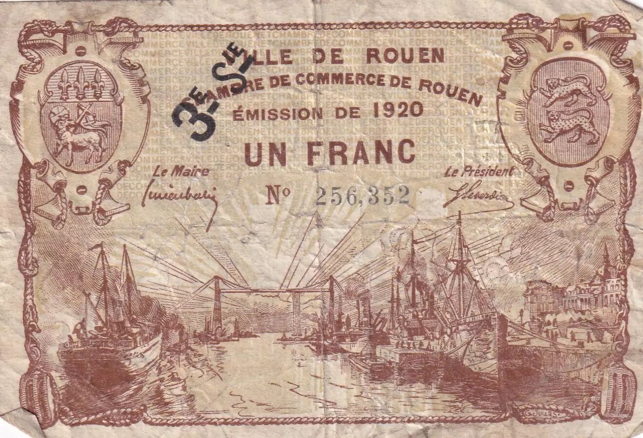 This 1 Franc banknote, issued by the Rouen Chamber of Commerce in 1920, represents a form of fractional currency issued during a period of economic crisis. It is a banknote from the 3rd series, bearing the identification number 256.352.