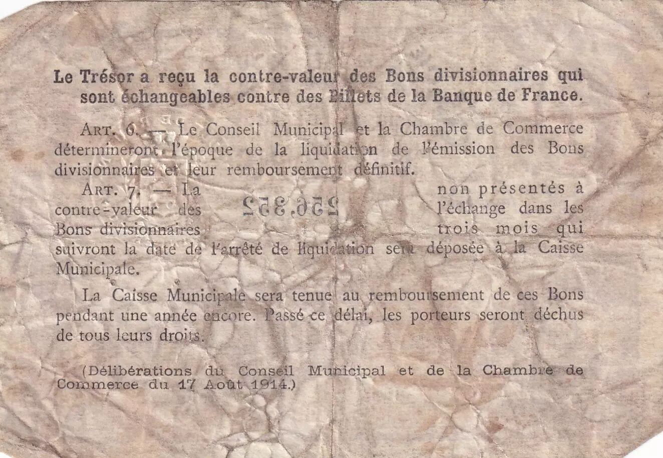 The reverse of the banknote contains important legal and financial information. It specifies that "The Treasury has received the equivalent value of the Fractional Bonds which are exchangeable for Bank of France Banknotes." Articles 6 and 7 of the deliberations of the Municipal Council and the Chamber of Commerce of August 17, 1914 are reproduced, detailing the methods of liquidation of the issue of Fractional Bonds and their definitive reimbursement. These articles also stipulate the deadlines and conditions of reimbursement, as well as the consequences for holders who do not respect these deadlines. The mention of Imprimerie Richard, Paris, is repeated at the bottom of the banknote.