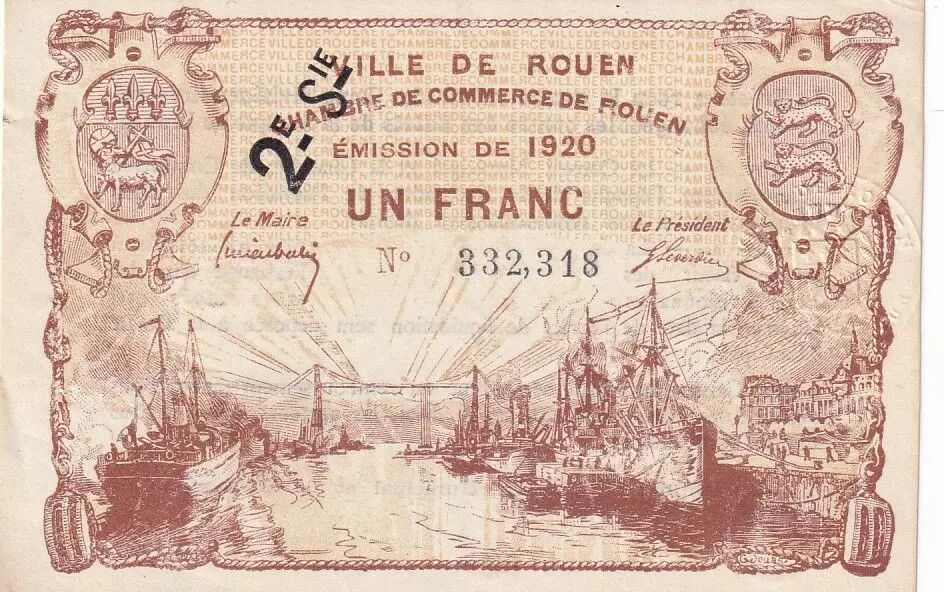 Au recto du billet, on observe un médaillon orné d'un écu héraldique à chaque coin supérieur. Le centre du billet présente une vue détaillée du port de Rouen, offrant un aperçu de l'activité maritime de la ville à cette époque. On peut lire les inscriptions "VILLE DE ROUEN", "CHAMBRE DE COMMERCE DE ROUEN", et la date "1918". La valeur nominale "UN FRANC" est clairement indiquée. La mention "IMP. RICHARD PARIS" indique l'imprimeur responsable de la production de ce billet.