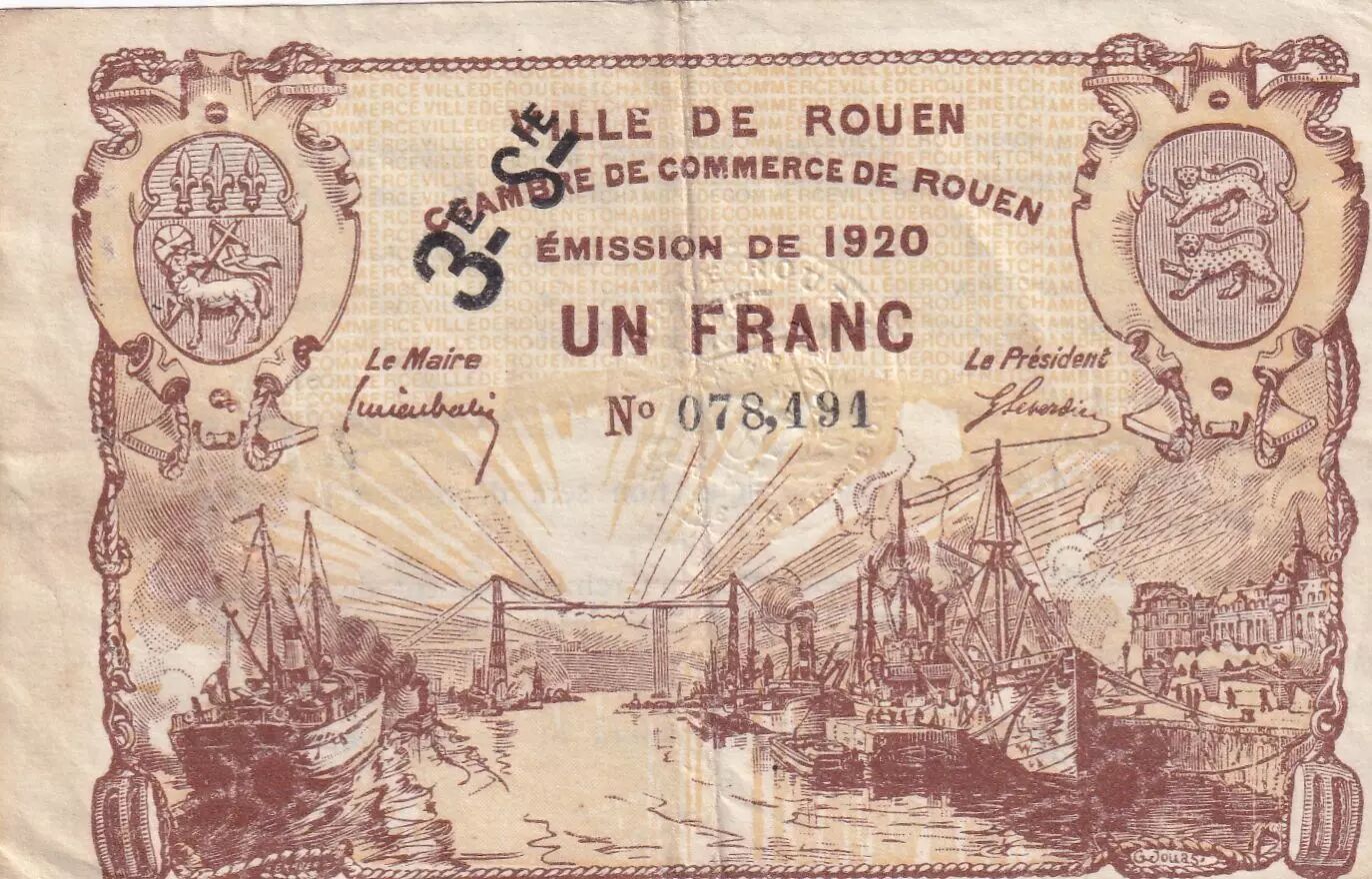 Ce billet de 1 Franc, émis par la Chambre de Commerce de Rouen, date de 1920. Il appartient à la 3ème série de cette émission locale et porte le numéro d'identification 078.191.