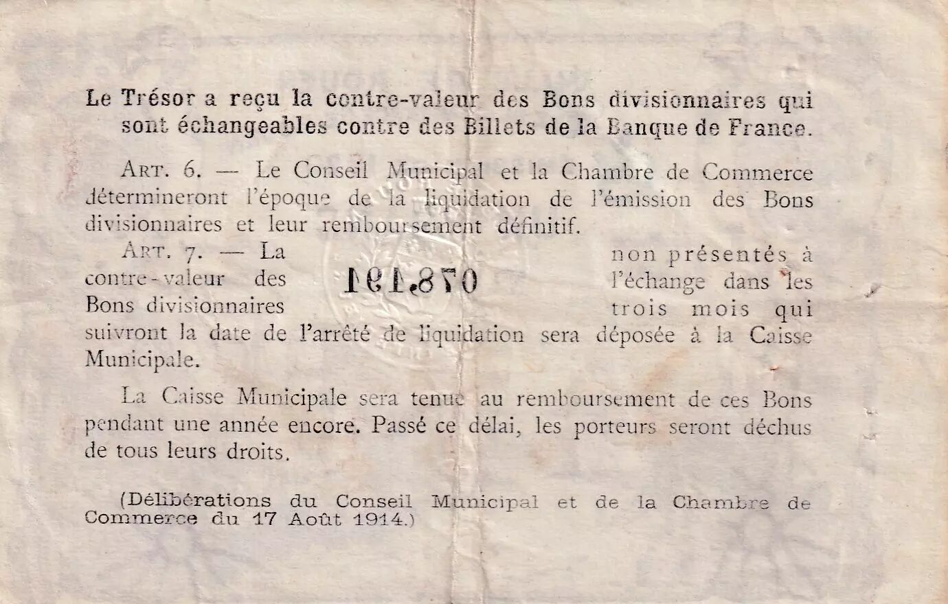 Le verso du billet contient un texte informatif relatif à l'émission et à la validité de ce type de bon divisionnaire. Il précise que "Le Trésor a reçu la contre-valeur des Bons divisionnaires qui sont échangeables contre des Billets de la Banque de France." Les articles 6 et 7 des délibérations du Conseil Municipal et de la Chambre de Commerce du 17 Août 1914 sont reproduits, détaillant les modalités de liquidation de l'émission, les conditions de remboursement, et les délais impartis aux porteurs pour l'échange des bons, ainsi que les conséquences du non-respect de ces délais. Ces informations légales encadrent l'émission de cette monnaie de nécessité.