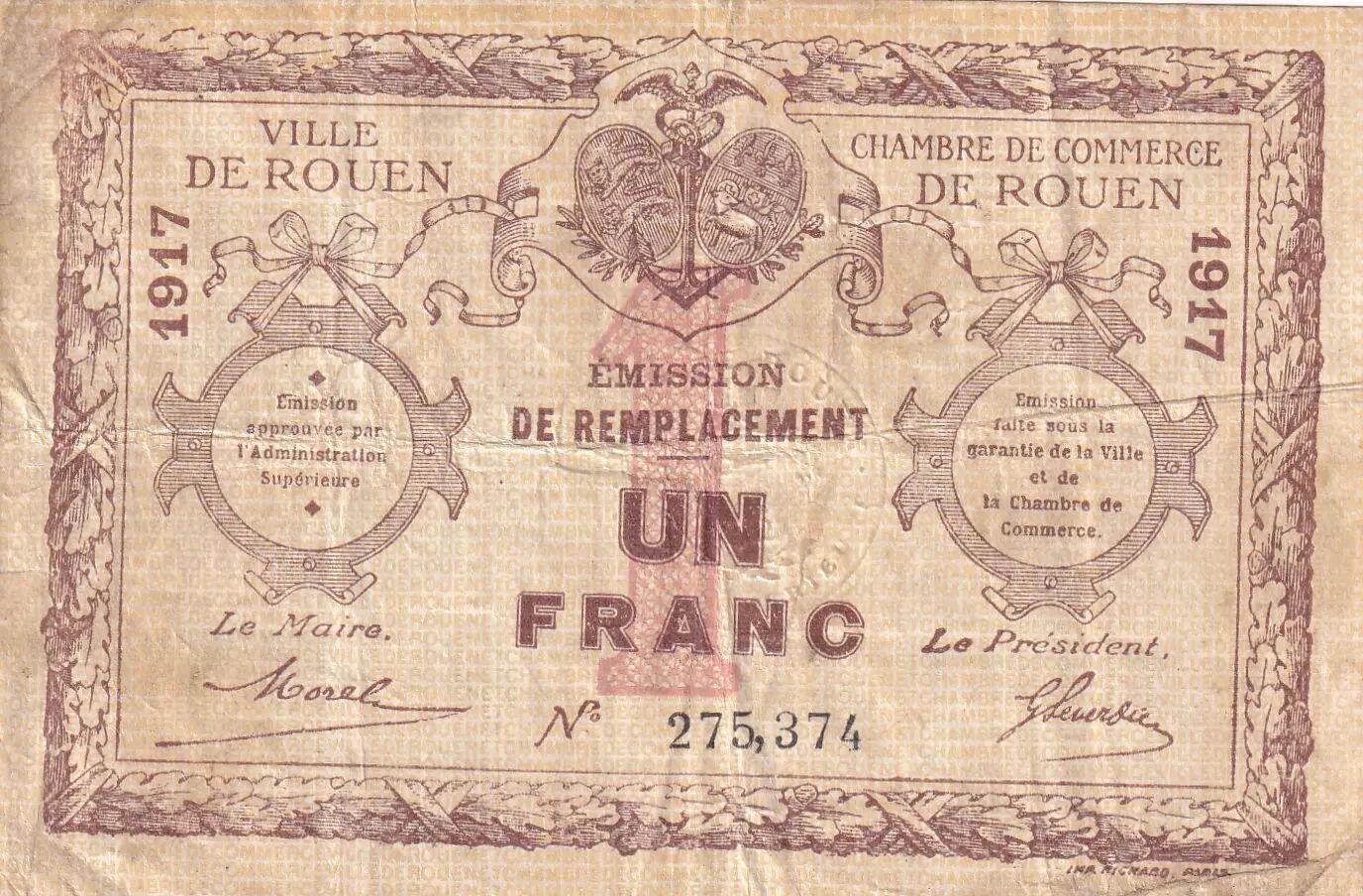 This 1 franc banknote was issued in 1917 by the Rouen Chamber of Commerce as a replacement issue. The obverse of the banknote features the face value "Un Franc" in the upper left, followed by the words "Ville De Rouen" and "Chambre De Commerce de Rouen". The year of issue, 1917, is also featured on this side. The words "ÉMISSION DE REMPLACEMENT" (REPLACEMENT ISSUE) are also present. The signatures of the Mayor and the President are affixed, and a serial number, such as "N° 275.374", is printed. The name of the printer, "IMP RICHARD, PARIS", is also mentioned on the obverse.