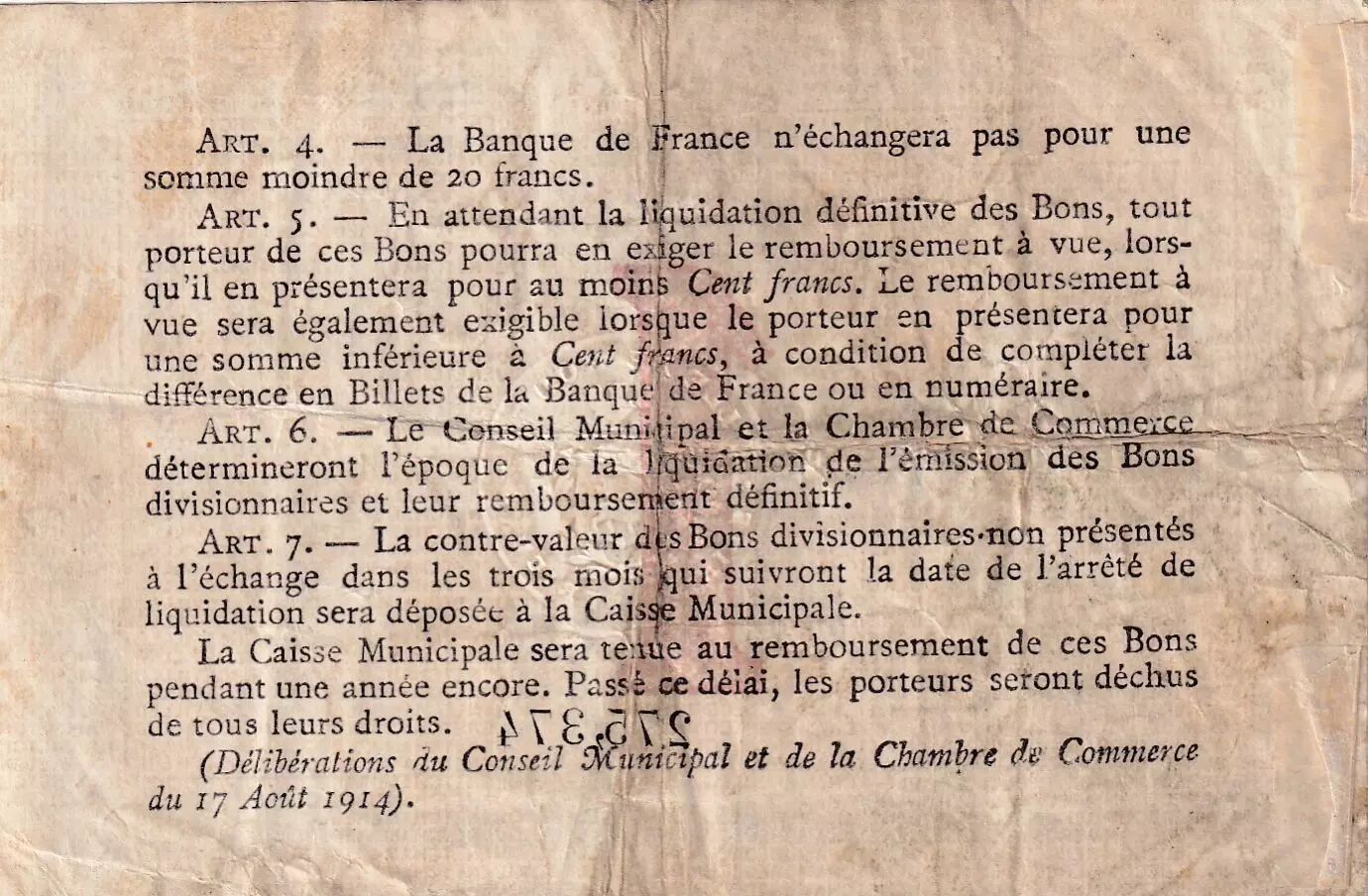The reverse of the banknote contains legal and regulatory inscriptions relating to the issue and exchange of these vouchers. Article 4 stipulates that the Banque de France will not exchange these banknotes for an amount less than 20 francs. Article 5 specifies the conditions for the repayment of the vouchers on demand, in particular for holders presenting at least 100 francs or completing the difference with banknotes from the Banque de France or in cash. Article 6 assigns responsibility to the Municipal Council and the Chamber of Commerce for determining the time of liquidation and final repayment of the fractional vouchers. Finally, Article 7 indicates that the counter-value of vouchers not presented for exchange within three months of the liquidation date will be deposited with the Caisse Municipale, which will ensure repayment for an additional year, after which the holders will forfeit their rights.