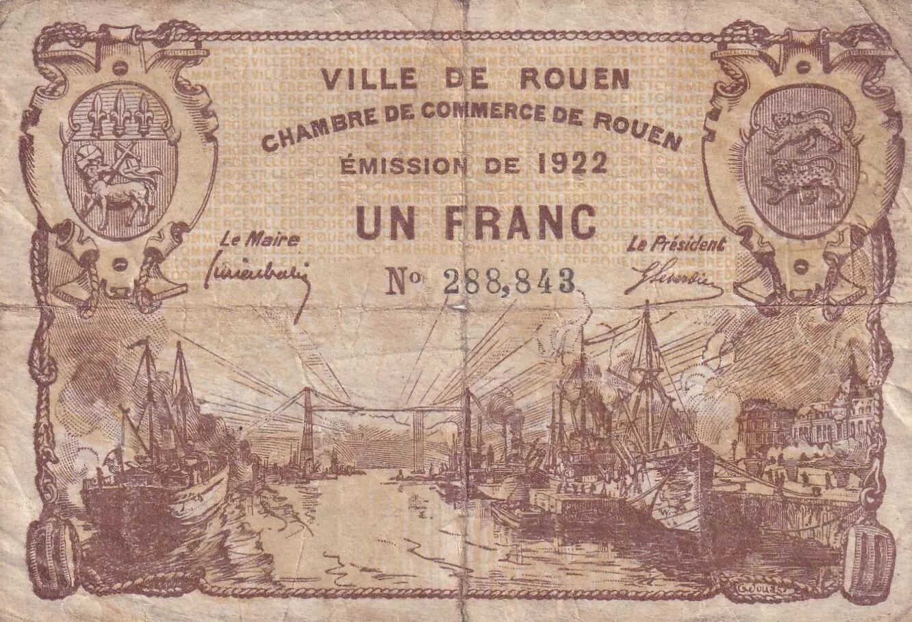On the front, the face value "Un Franc" is clearly indicated, followed by the mention "Ville De Rouen" and "Chambre De Commerce de Rouen", identifying the issuer. The year of issue, 1922, is prominently displayed, as is the mention "Émission de remplacement", emphasizing the context of its issue. A serial number, here No. 288.843, is printed, ensuring the unique identification of each note. The signatures of the Mayor and the President of the Chamber of Commerce authenticate the note. The mention "IMP. RICHARD PARIS" indicates the printer responsible for the production of the note.