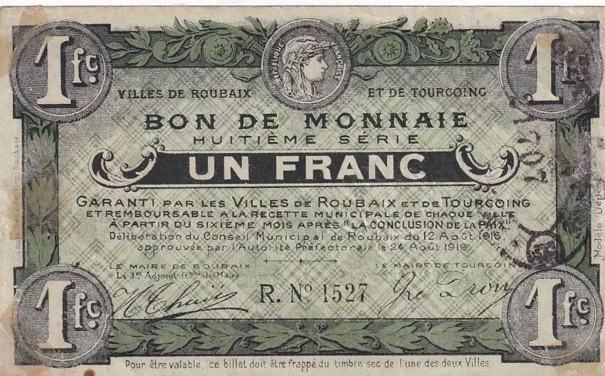 This 1 franc banknote, issued by the cities of Roubaix and Tourcoing, dates from August 12, 1916, and belongs to the eighth series of these local issues. It is a currency bond, guaranteed by the two cities and redeemable at the municipal revenue office of each, six months after the conclusion of peace.
