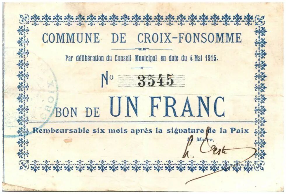 Billet France 1 Franc Croix-Fonsomme Commune - 1915