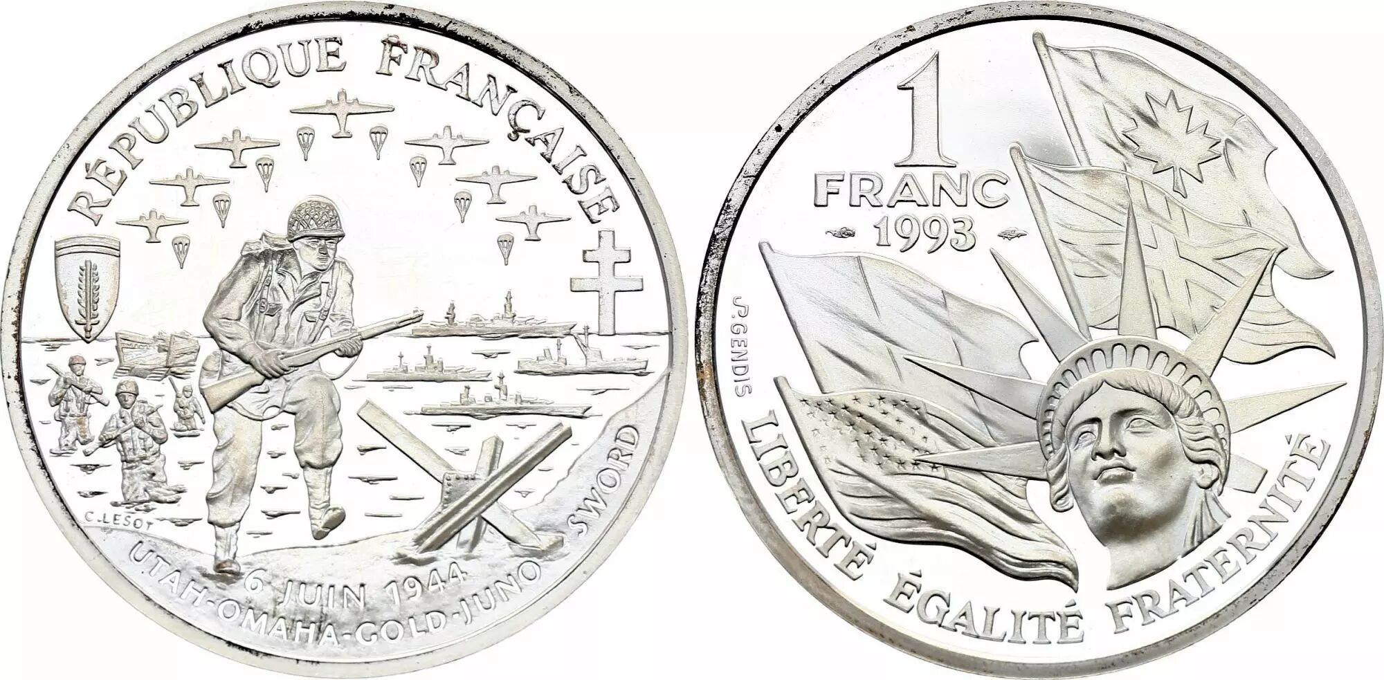 Le revers de la pièce arbore la légende circulaire "LIBERTÉ ÉGALITÉ FRATERNITÉ". Au centre, on retrouve la statue de la Liberté, avec les drapeaux des forces alliées en arrière-plan. La valeur faciale de "1 FRANC" et la date "1993" sont disposées en trois lignes en haut à gauche. La signature "JP GENDIS" est inscrite près du listel, à gauche. La tranche de la pièce est lisse. Elle a été frappée par la Monnaie de Paris.