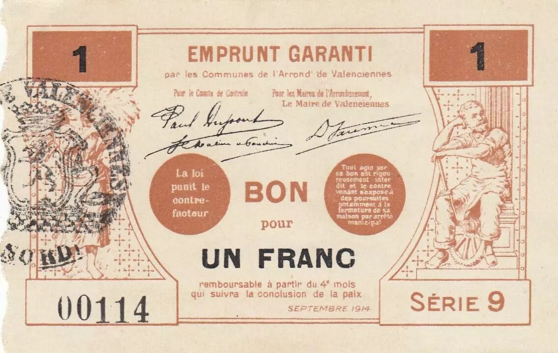 Banknote France 1 Franc - Emprunt Garanti - L'Arrond de Valenciennes - 09-1915 - Serial 9