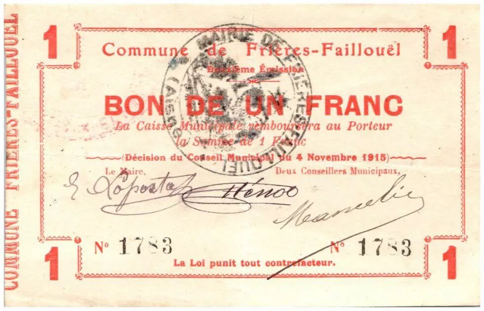 Home > > France 1 Franc Frieres-Faillouel City - 1915
